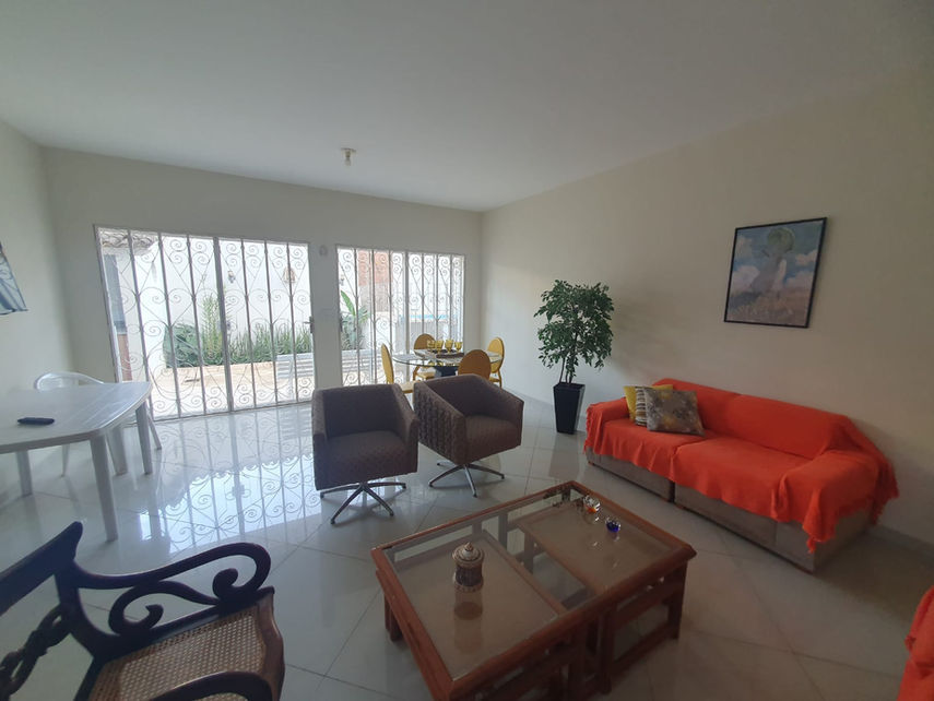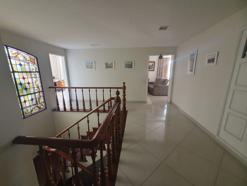 No primeiro pavimento, encontramos um escritório que pode ser revertido em um quarto, uma lavanderia, estrategicamente posicionada, proporciona comodidade ao lidar com tarefas domésticas. Um banheiro social recém reformado atende às necessidades tanto dos moradores quanto dos visitantes. Uma cozinha para atender o primeiro andar, um amplo salão que convida a momentos de convivência e entretenimento e que dar acesso à uma área de lazer com churrasqueira e piscina, é um convite irresistível para momentos de descontração e diversão, e duas vagas de garagem cobertas garantem a proteção dos veículos.